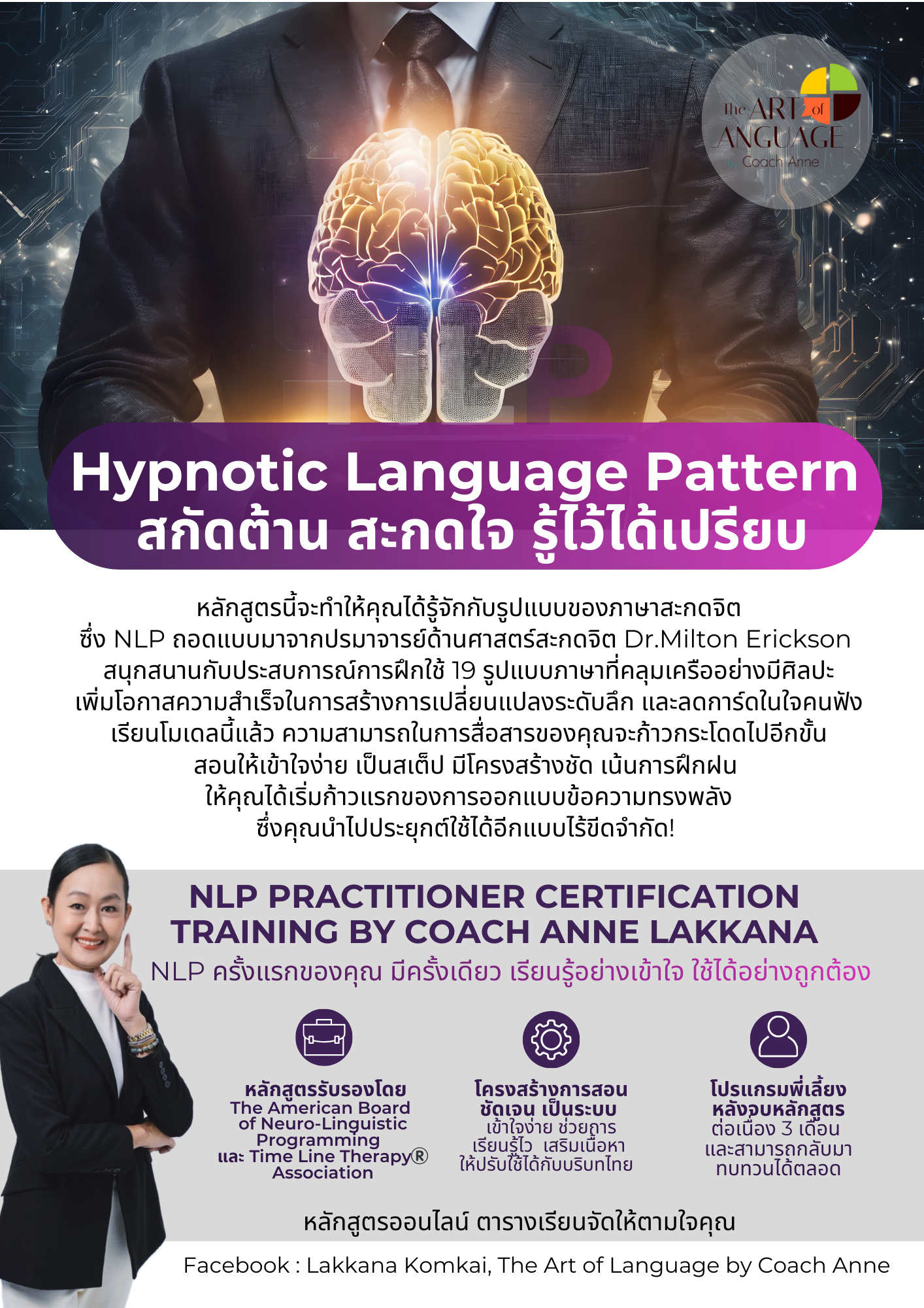 The Art of Language โดยโค้ชแอน ลักขณา นำเสนอหลักสูตร NLP ที่หลากหลาย ซึ่งออกแบบมาเพื่อตอบสนองความต้องการของผู้ที่สนใจพัฒนาตนเองในด้านต่างๆ เช่น การสร้างความสัมพันธ์ที่ดีขึ้น การตั้งเป้าหมายที่ชัดเจน การควบคุมอารมณ์ และการปรับเปลี่ยนความเชื่อ หลักสูตรเหล่านี้เหมาะสำหรับบุคคลทั่วไปที่ต้องการพัฒนาทักษะส่วนบุคคล ผู้นำองค์กร ผู้จัดการ หรือผู้ที่ทำงานด้านการสื่อสารและต้องการเพิ่มประสิทธิภาพในการทำงานและชีวิตส่วนตัว